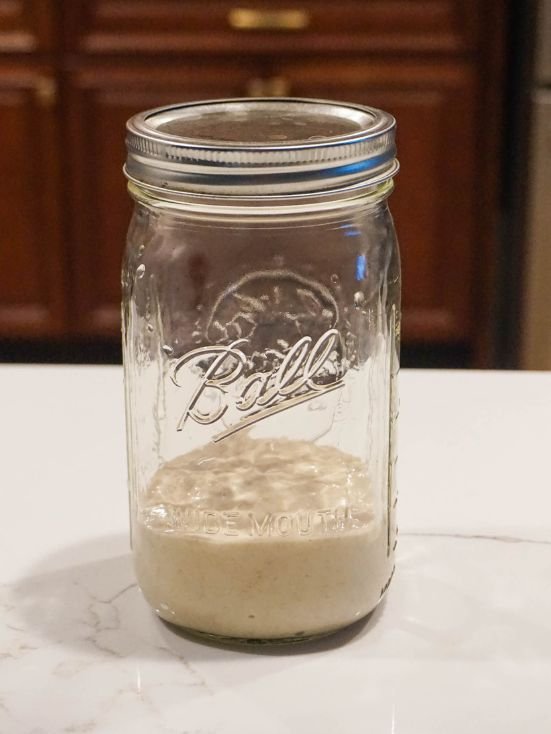 Pick a clean quart-sized mason jar or glass bowl. Make sure it’s big enough for your starter to grow and bubble. I’ve also used a ceramic bowl and plastic bowl, and they work well. Keep it in a spot with steady temperature and airflow. Cover it, but not too tight — your starter needs to breathe.