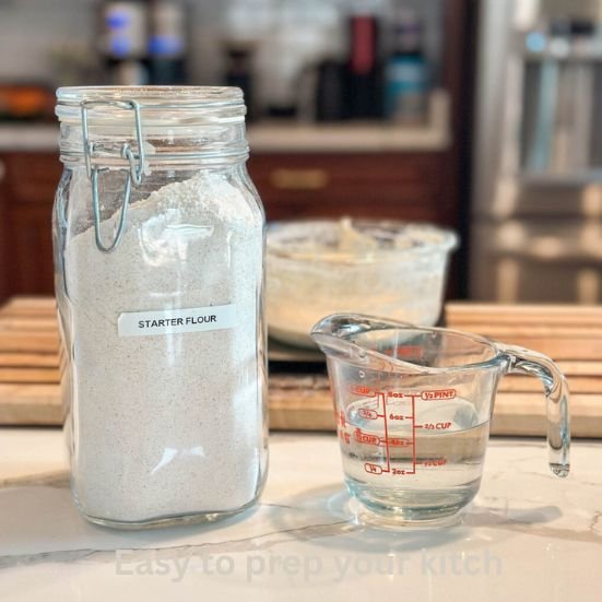 1. Take equal parts flour and water and mix them into your starter. Stir well. This keeps the yeast active and ready for baking.