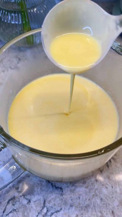 - Add 95g milk and 95g heavy whipping cream. Stir slowly so you don’t create bubbles.