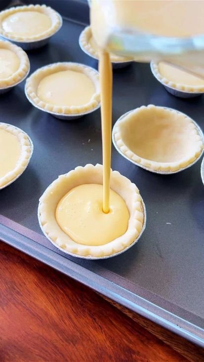 - Pour the custard filling into the tart shells. Fill each about 80%–90% full.